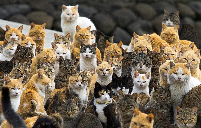 يعيش عدد كبير من القطط البرية في جزيرة أوشيما التابعة لليابان عددها يتجاوز ستة أضعاف عدد سكان على الجزيرة. وكان السكان في البداية يستعينون بالقطط للقضاء على الفئران، ماجعل عدد القطط يتزايد بشكل سريع. ويوجد في الجزيرة أكثر من 200 قط حتى الآن، ولكن عدد سكان قليل جدا، أغلبهم من المسنين الذين يسكنون الجزيرة منذ الحرب العالمية الثانية.
