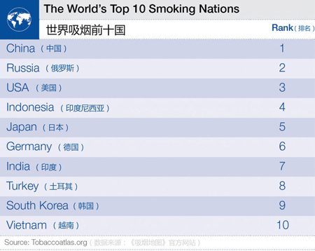 7 يوليو 2015/صحيفة الشعب اليومية أونلاين/ذكر مركز أبحاث "Agenda" للمنتدى الاقتصادي العالمي نقلا عن أحدث تقرير صادر عن " أطلس التبغ"، إن الدول الآسيوية مثلت اغلبية الدول التي تحتل المراكز العشرة الأولى عالميا من حيث مستوى التدخين في عام 2014، في حين تصدرت الصين القائمة. وبلغ إجمالي حجم استهلاك التبغ في العالم 5.8 تريليون سيجارة في عام 2014، فتجاوز حجم الاستهلاك الصيني مجموع 29 دولة أولى أخرى، كما انها أعلى من مجموع استهلاك التبغ لجميع البلدان الأخرى ذات الدخل المتوسط والمنخفض.