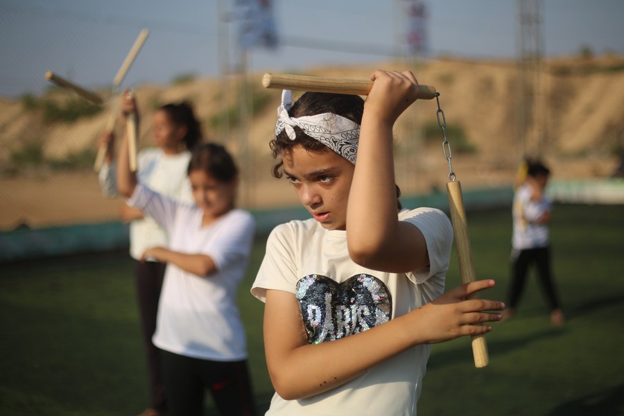 فتاة تتدرب على فنون "كونغ فو" القتالية الصينية، في مدينة رفح جنوب قطاع غزة، في 9 أغسطس 2021.