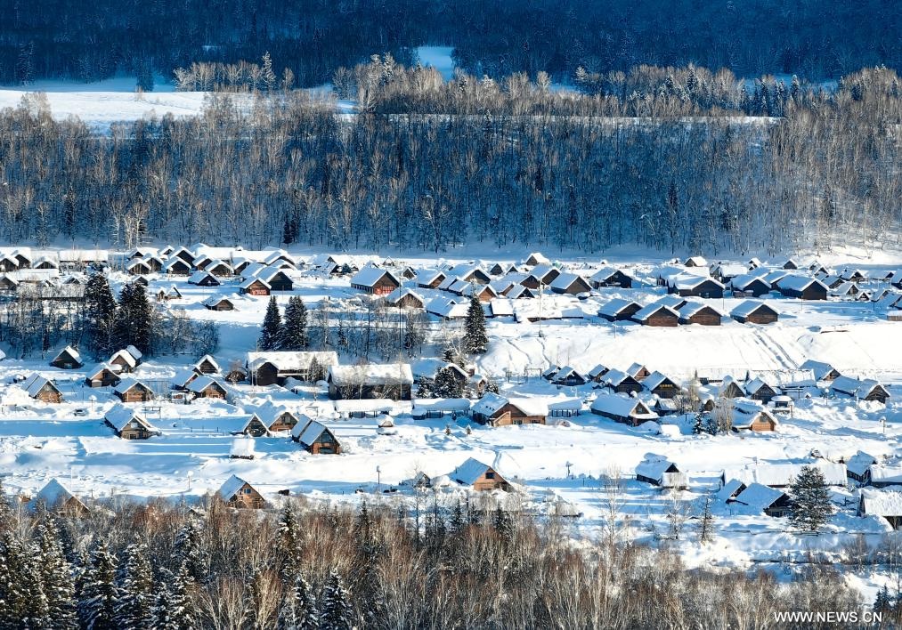 آلتاي 21 يناير 2024 (شينخوا) في الصورة الملتقطة يوم 17 يناير 2024، مشهد لقرية خمو بعد تساقط الثلوج في ولاية آلتاي بمنطقة شينجيانغ الويغورية ذاتية الحكم في شمال غربي الصين.