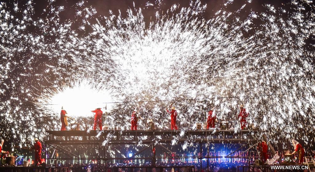 لوهيانغ 30 يناير 2024 (شينخوا) في الصورة الملتقطة يوم 28 يناير 2024، فنانون شعبيون يؤدون عرض "الزهور الحديدية"، وهو عرض فني شعبي لرمي الحديد المنصهر لإنشاء ألعاب نارية في مهرجان المعبد بمدينة لوهيانغ في مقاطعة خنان بوسط الصين.