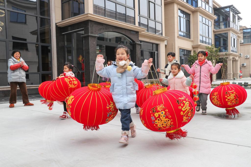بكين 9 فبراير 2024 (شينخوا) في الصورة الملتقطة يوم 8 فبراير 2024، أطفال يلعبون وفي أيديهم فوانيس حمراء بعد انتقالهم إلى منازل جديدة في بلدة شينآن بمدينة هوتشو في مقاطعة تشجيانغ بشرقي الصين.