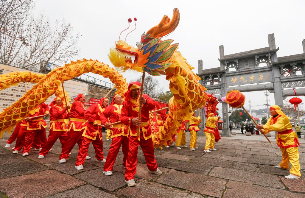 بكين 9 فبراير 2024 (شينخوا) في الصورة الملتقطة يوم 8 فبراير 2024، فريق لرقصة التنين يقدم عرضا في أحد الشوارع القديمة بمدينة هوانغشان في مقاطعة آنهوي بوسط الصين.
