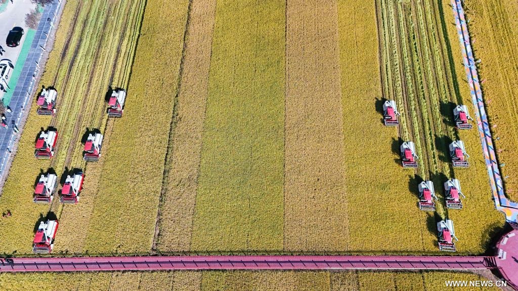 هاربين 22 سبتمبر 2024 (شينخوا) في الصورة الملتقطة بطائرة بدون طيار يوم 22 سبتمبر 2024، حصادات تعمل في حقل أرز في محافظة فانغتشنغ في هاربين بمقاطعة هيلونغجيانغ شمال شرقي الصين.