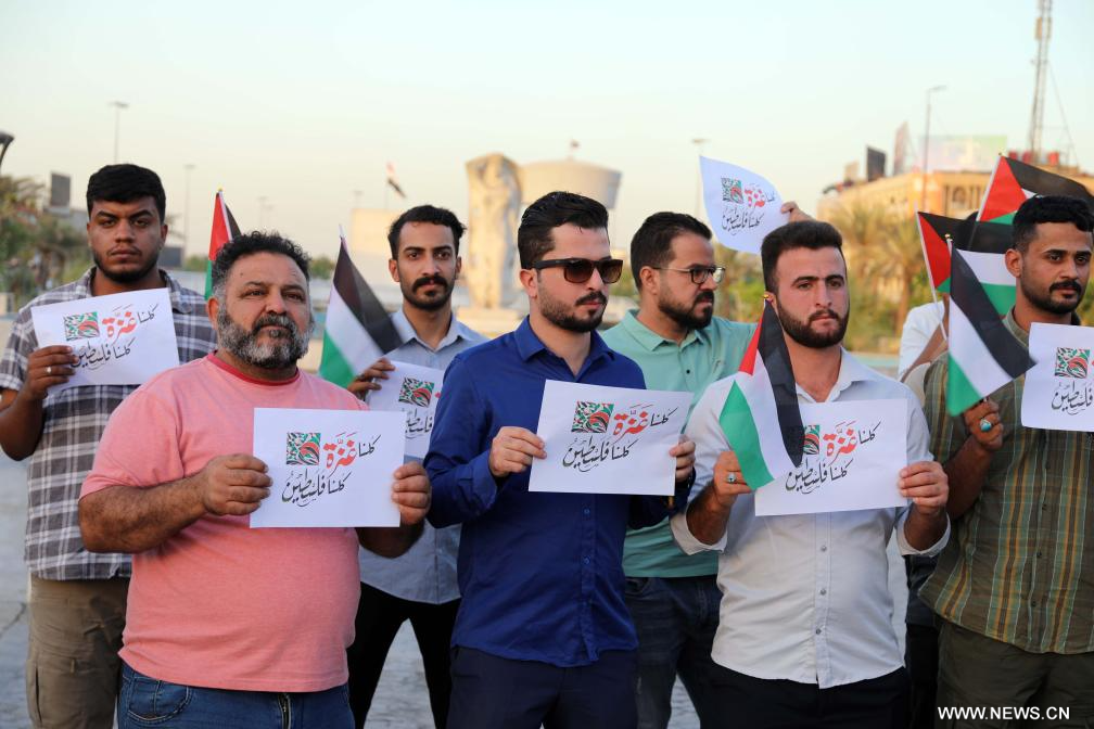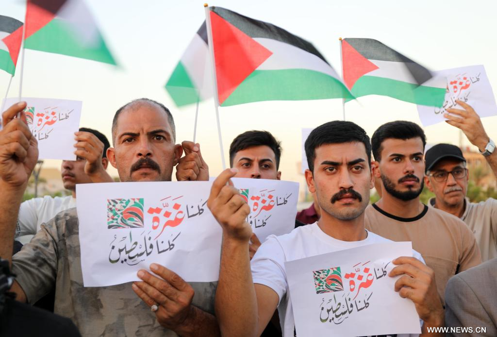 | بغداد 23 سبتمبر 2025 (شينخوا) في الصورة الملتقطة يوم 23 سبتمبر 2025، عراقيون يشاركون في مسيرة لإظهار تضامنهم مع سكان قطاع غزة، في بغداد. |