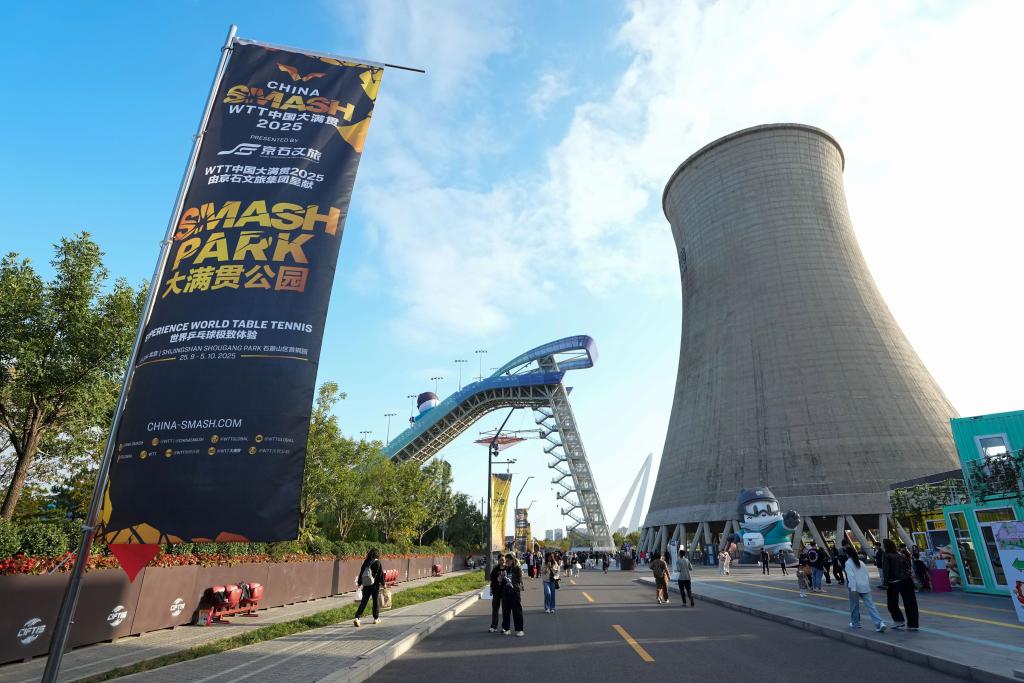 | في الصورة الملتقطة يوم 3 أكتوبر 2025، زوار في حديقة "سماش" حيث أقيم حدث لمباريات "سماش" في الصين لبطولة العالم لكرة الطاولة 2025 في العاصمة الصينية بكين. |