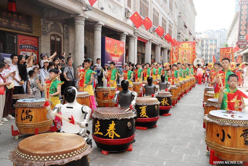 في الصورة الملتقطة يوم 6 أكتوبر 2025، أشخاص وروبوتات يعزفون على الطبول في موقع سياحي في مدينة شانتو بمقاطعة قوانغدونغ بجنوبي الصين. وشارك الناس في فعاليات ثقافية شعبية تقليدية متنوعة للاحتفال بعيد منتصف الخريف الذي صادف يوم 6 أكتوبر العام الجاري. |