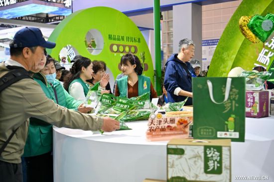 تيانجين 18 أكتوبر 2025 (شينخوانت) في الصورة الملتقطة يوم 17 أكتوبر 2025، أشخاص يزورون معرض الصين الدولي الـ22 للتجارة الزراعية في بلدية تيانجين بشمالي الصين. انطلق المعرض يوم الجمعة الماضي ويستمر حتى 19 أكتوبر. يضم المعرض 12 منطقة عرض، وشهد عرض حوالي 25 ألف نوع من المنتجات الزراعية، التي قدمها أكثر من 3 آلاف عارض.