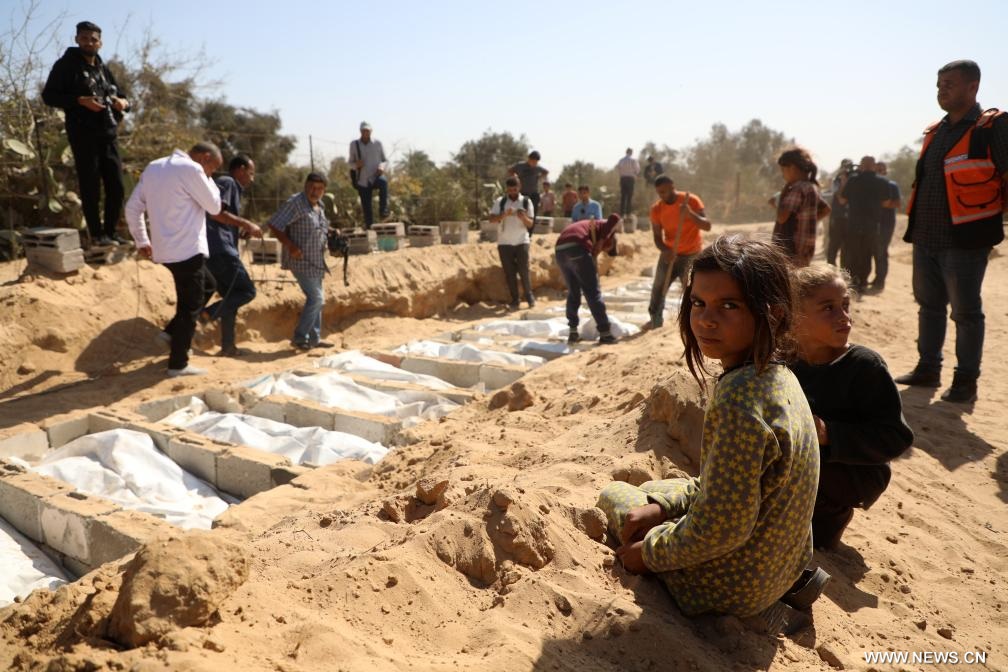 غزة 22 أكتوبر 2025 (شينخوا) في الصورة الملتقطة يوم 22 أكتوبر 2025، دفن جثامين لفلسطينيين مجهولي الهوية في دير البلح وسط قطاع غزة.