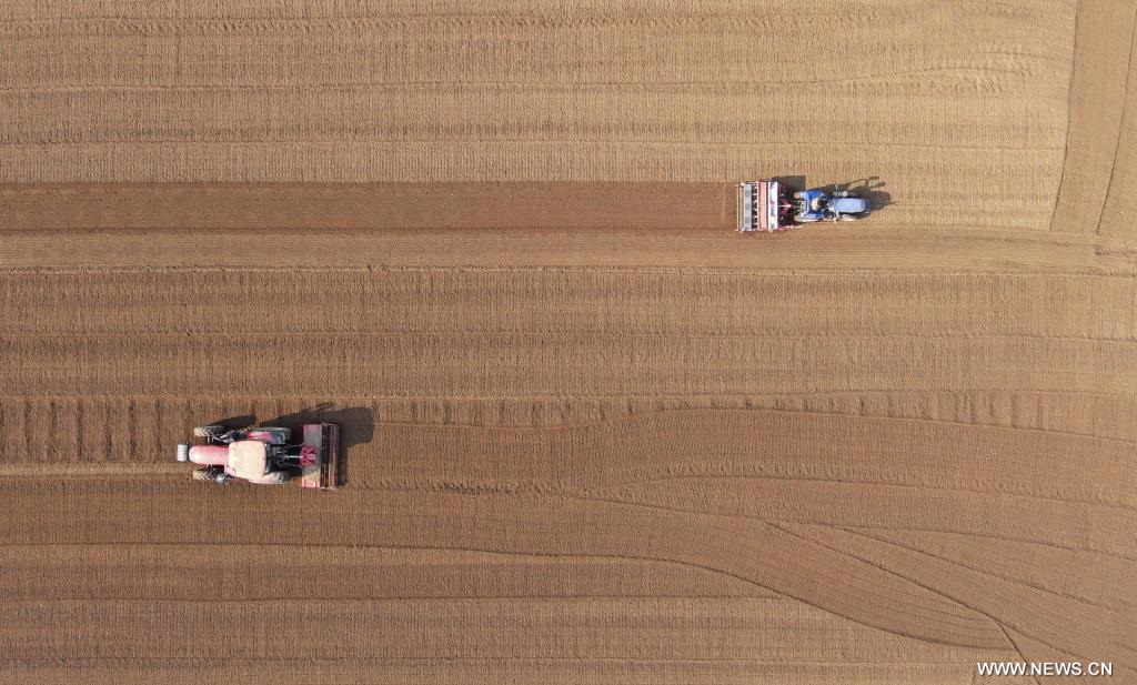 | في الصورة الملتقطة يوم 3 نوفمبر 2025، جانب من أعمال زراعة القمح في مدينة شينله في مقاطعة خبي بشمالي الصين. وحتى يوم 30 أكتوبر الماضي، تم حصاد أكثر من 90 بالمائة من الحبوب الخريفية وزراعة أكثر من 25 بالمائة من القمح الشتوي في أنحاء البلاد. |