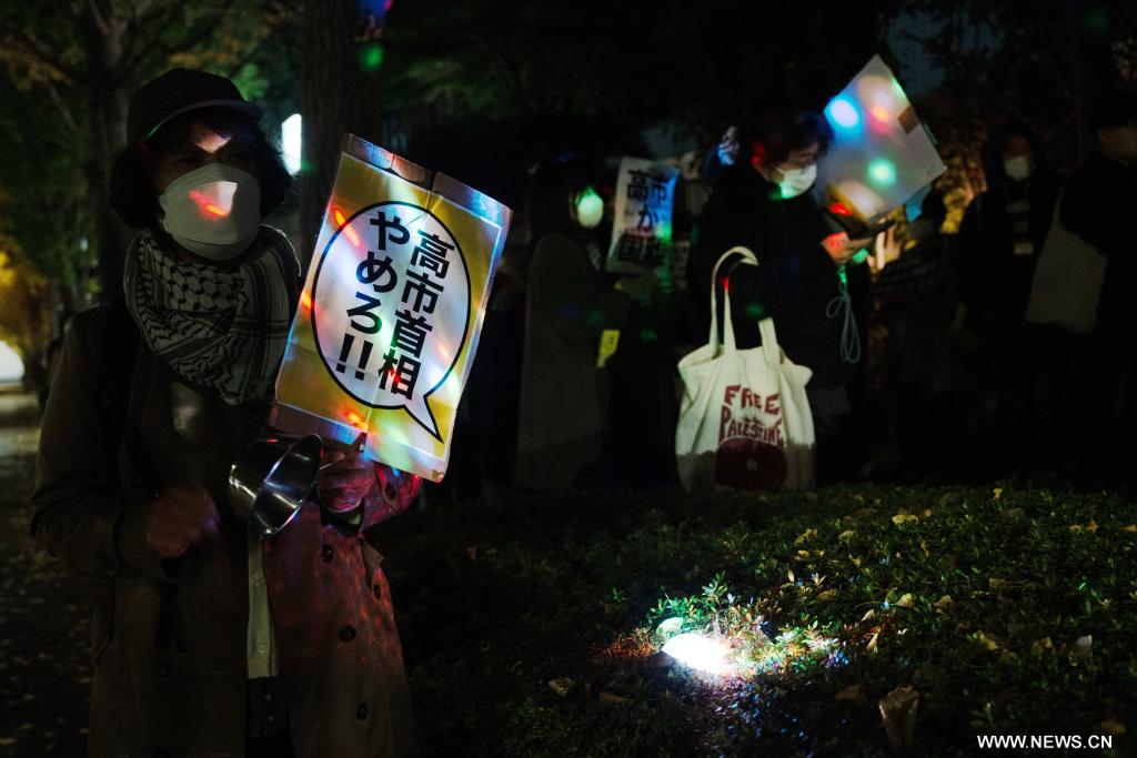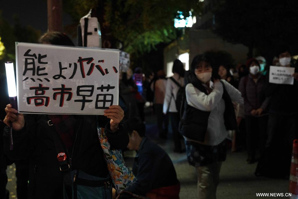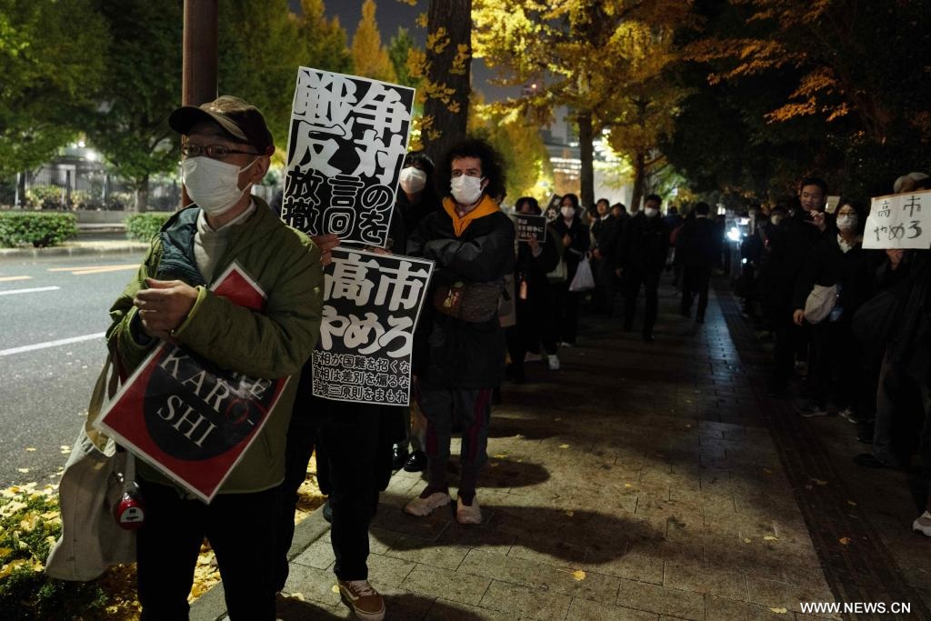 طوكيو 22 نوفمبر 2025 (شينخوا) نظم مئات اليابانيين مظاهرة أمام مقر إقامة رئيسة الوزراء في طوكيو يوم الجمعة، مطالبين رئيسة الوزراء ساناي تاكايتشي بالتراجع عن تصريحاتها الخاطئة الأخيرة بشأن تايوان وتقديم تفسير واعتذار.