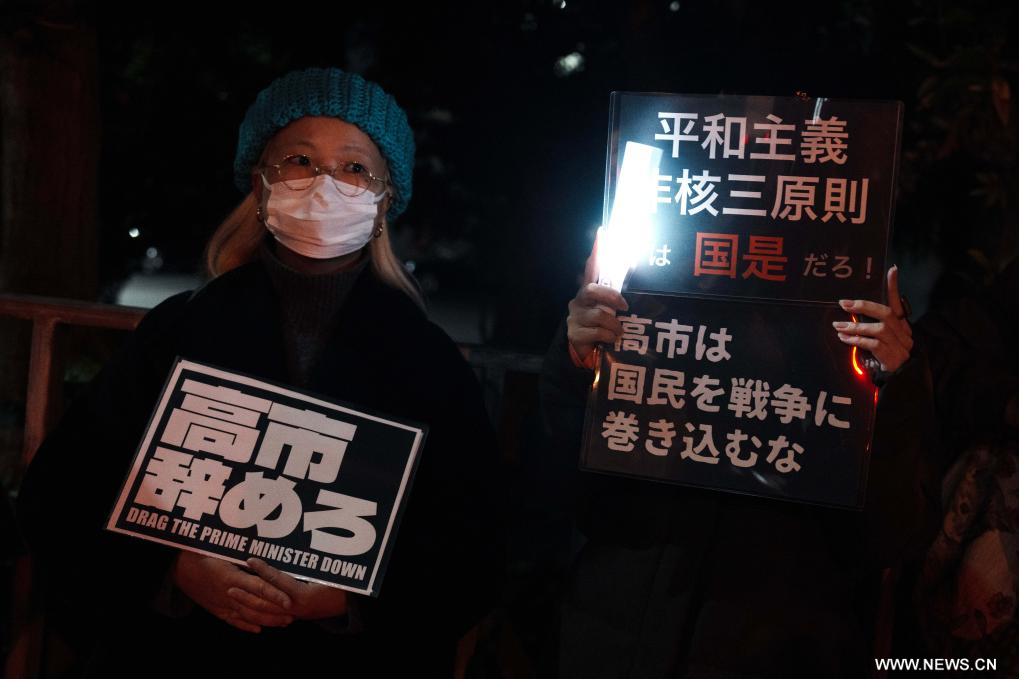 بدأ المشاركون في التوافد إلى موقع المظاهرة في حوالي الساعة 7 مساء بالتوقيت المحلي، حاملين لافتات كتبت عليها شعارات مثل "تراجعي عن تصريحاتك، عارضي الحرب"، و"كل هذا بسبب تاكايتشي"، و"ارحلي يا تاكايتشي"، كما رددوا شعارات مثل "امنعوا عودة النزعة العسكرية".