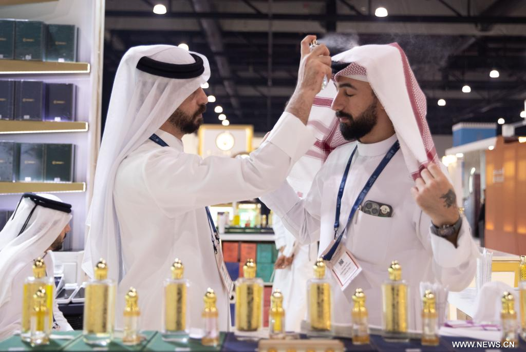 المنامة 25 نوفمبر 2025 (شينخوا) في الصورة الملتقطة يوم 25 نوفمبر 2025، رجل يرش العطر على زائر آخر خلال معرض "العطور العربية" في المنامة، البحرين.