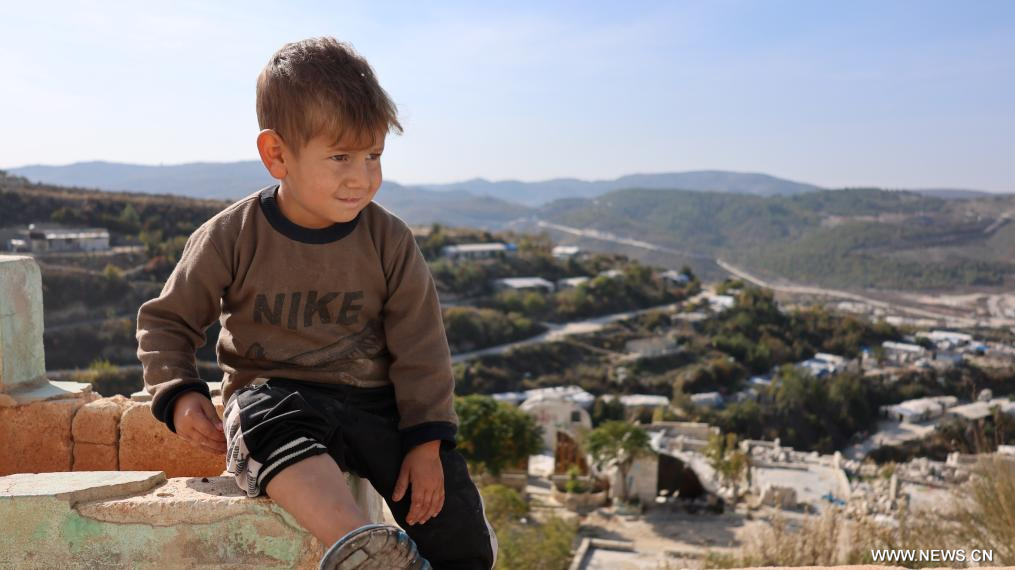 | في الصورة الملتقطة يوم 20 نوفمبر 2025، طفل يجلس في مخيم داخل قرية خربة الجوز الواقعة في محافظة إدلب بشمال غربي سوريا. |