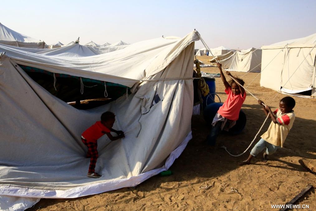 | الصورة الملتقطة يوم 13 نوفمبر 2025، أطفال نازحون ينصبون خيمة في مخيم العفاض للنازحين في مدينة الدبة شمالي السودان. |