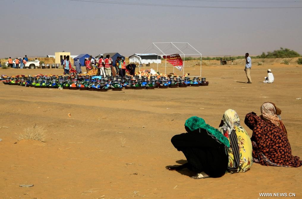 | في الصورة الملتقطة يوم 13 نوفمبر 2025، نازحون يحملون مساعدات إنسانية في مخيم العفاض للنازحين في مدينة الدبة شمالي السودان. |