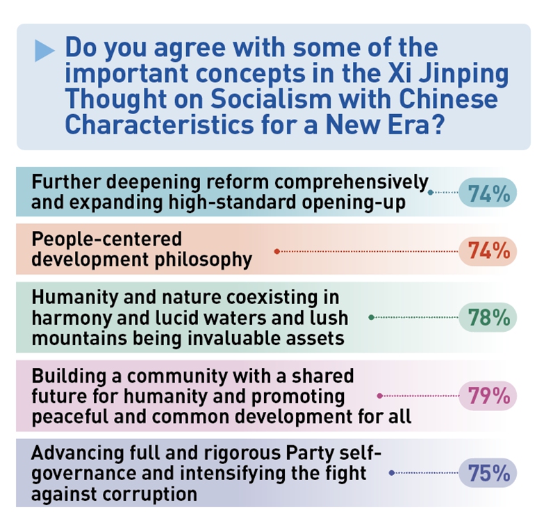 وتضمّن الاستطلاع أسئلة للمشاركين الأجانب حول عدد من المفاهيم الرئيسية الواردة في فكر شي جين بينغ حول الاشتراكية ذات الخصائص الصينية في العصر الجديد، حيث حظيت مفاهيم مثل، بناء "مجتمع المصير المشترك للبشرية" و"المياه الصافية والجبال الخضراء ثروات لا تُقدّر بثمن" بموافقة ما يقرب من 80 % من المشاركين.