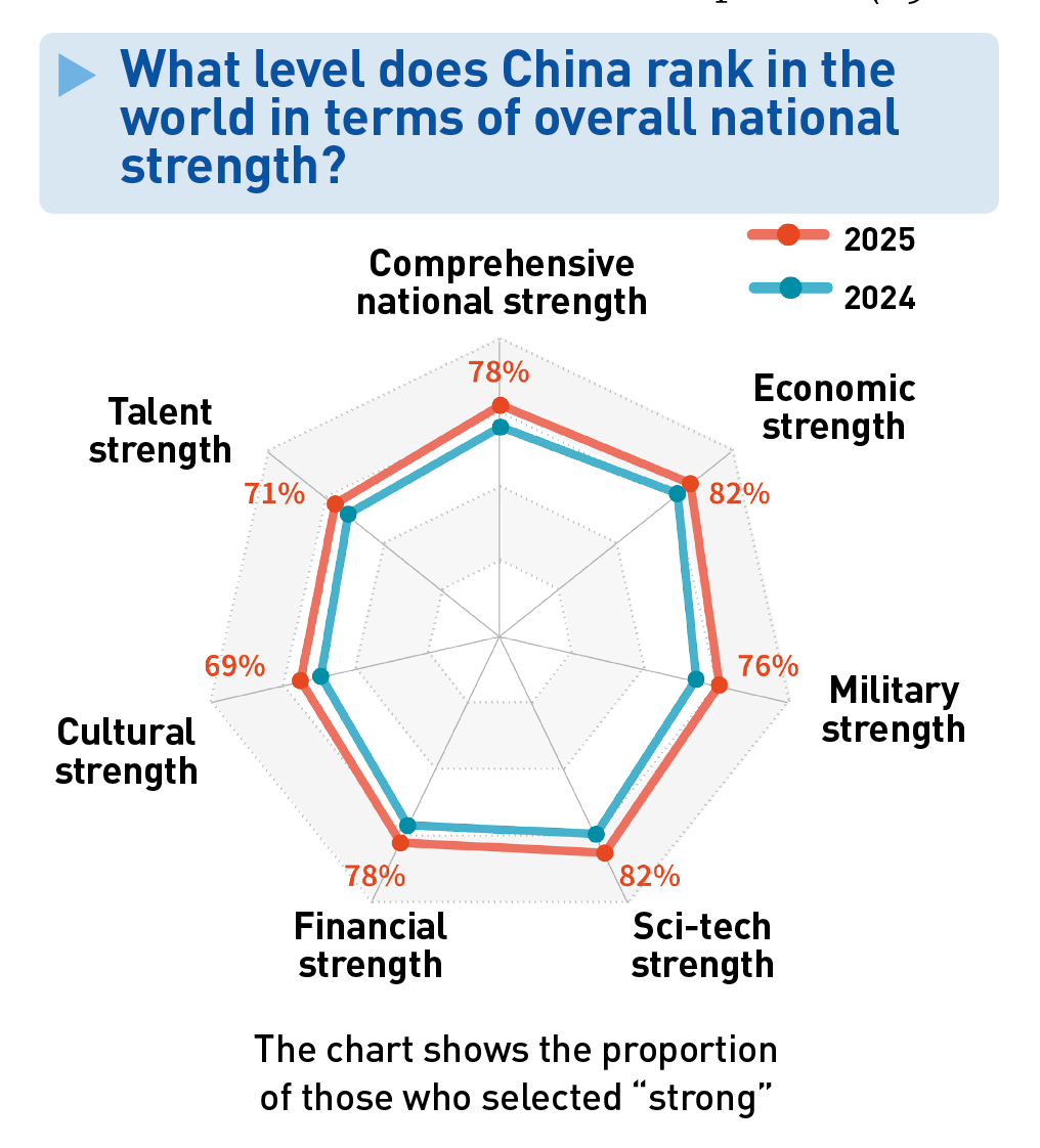 ووفقا للاستطلاع، اعترف نحو 80 % من المشاركين الأجانب بتنامي القوة الوطنية الشاملة للصين، في حين حمّل قرابة 70% منهم انطباعا إيجابيا عنها.