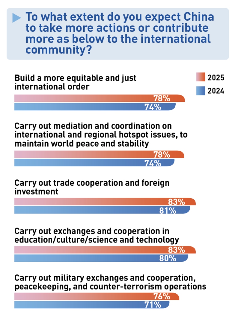 كما توقع حوالي 80 % من المشاركين أن تتخذ الصين مزيدا من الإجراءات أو أن تضطلع بدور أكبر في تعزيز نظام دولي أكثر عدلا وإنصافا، والوساطة في بؤر التوتر العالمية والإقليمية، وتعزيز التعاون الاقتصادي والتجاري والثقافي.