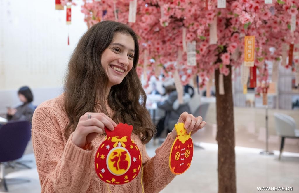 | تشونغتشينغ 4 فبراير 2026 (شينخوا) في الصورة الملتقطة يوم 3 فبراير 2026، طالبة جزائرية تعرض حقيبة حظ صنعت خلال فعالية أقيمت في حي بانان ببلدية تشونغتشينغ بجنوب غربي الصين. |