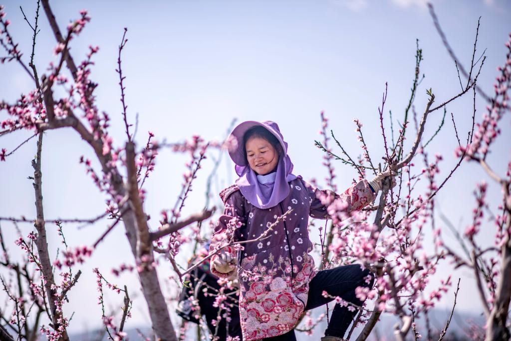 بكين 5 فبراير 2026 (شينخوا) في الصورة الملتقطة يوم 4 فبراير 2026، مزارعة تعتني بأزهار الخوخ بمدينة ونشان في مقاطعة يوننان بجنوب غربي الصين.