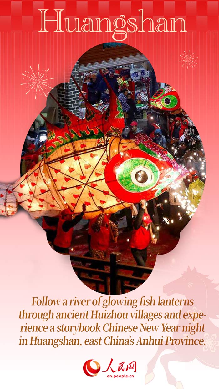 إذا كنت تبحث عن تجربة مختلفة لرأس السنة الصينية، فتوجه إلى هوانغشان في مقاطعة آنهوي شرق الصين، حيث تتلألأ الفوانيس في القرى القديمة. وخلال عيد الربيع، تنبض قرى هويتشو مثل تشانشي، وانغمانتيان، ويوليانغ، وتشنغكان بالحياة، بينما تتمايل الفوانيس المصممة على شكل أسماك الكوي الزاهية عبر الأزقة الحجرية على إيقاع الطبول، ناشرة الفرح والبهجة من زقاق إلى آخر.
