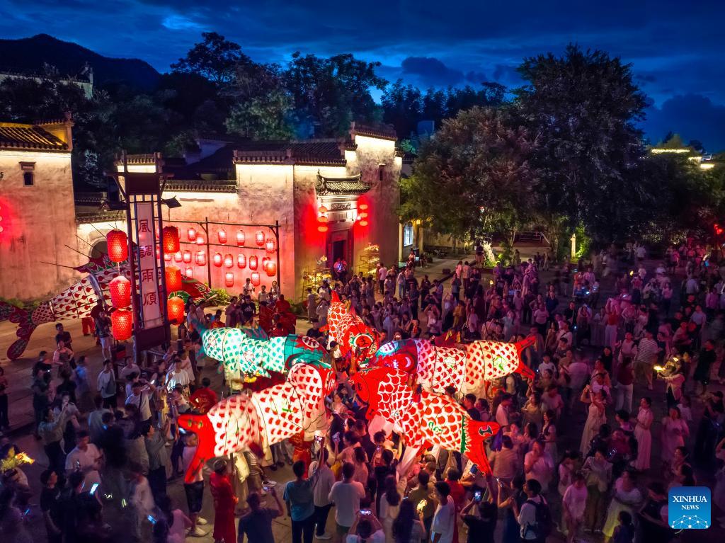 تُظهر صورة جوية التقطتها طائرة بدون طيار في 25 يوليو 2025 سياحا يتابعون موكب فوانيس على شكل أسماك في قرية تشنغكان بمنطقة هويتشو التابعة لمدينة هوانغشان، مقاطعة آنهوي شرق الصين.
