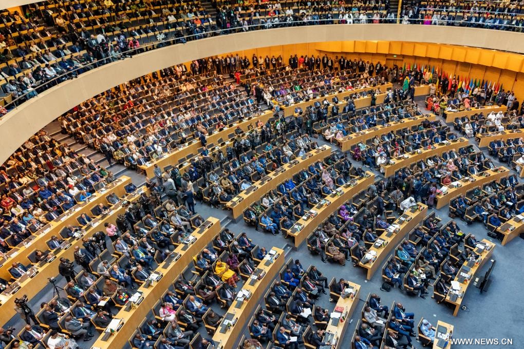 | أديس أبابا 14 فبراير 2026 (شينخوا) في الصورة الملتقطة يوم 14 فبراير 2026، مشهد للدورة العادية الـ39 لجمعية رؤساء دول وحكومات الاتحاد الإفريقي في مدينة أديس أبابا في إثيوبيا. وانطلقت القمة التي تستمر لمدة يومين، والتي جمعت قادة من الدول الأعضاء في الاتحاد الإفريقي، تحت شعار الاتحاد الإفريقي لعام 2026 "ضمان توافر المياه بشكل مستدام وأنظمة الصرف الصحي الآمنة لتحقيق أهداف أجندة 2063". |