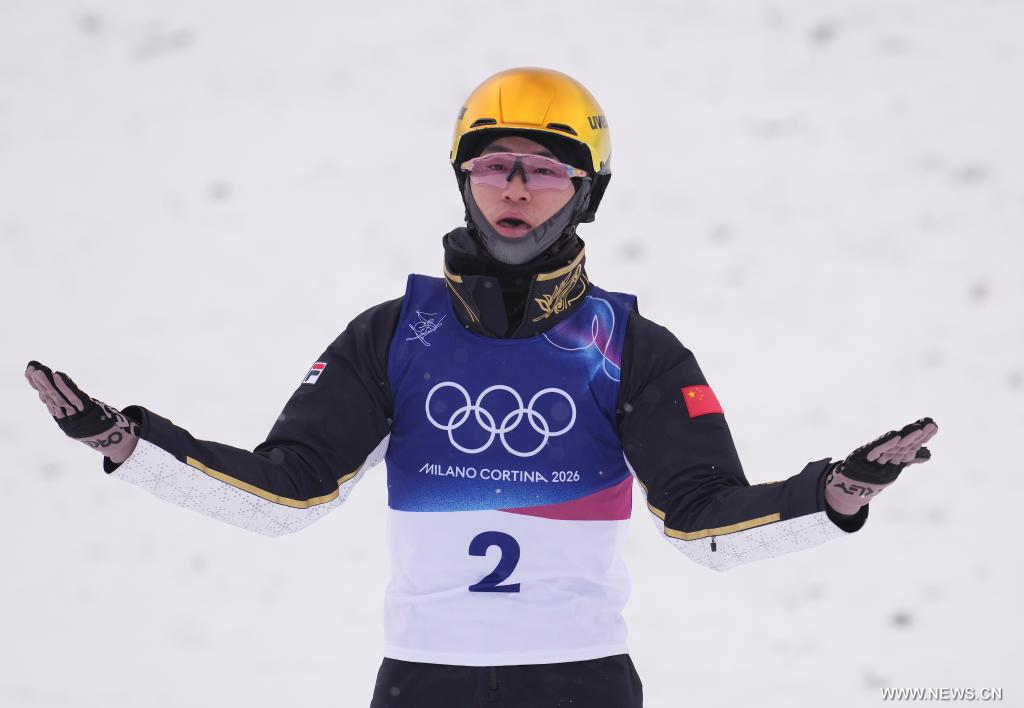 | في الصورة الملتقطة يوم 20 فبراير 2026، الصيني، لي تيان ما، يحتفل خلال الجولة الأولى لنهائي مسابقة القفزات الهوائية في التزلج الحر للرجال، ضمن دورة الألعاب الأولمبية الشتوية ميلانو-كورتينا 2026 في ليفينيو، إيطاليا. |