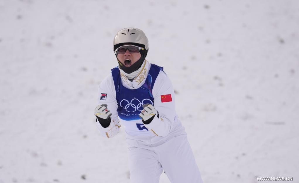 | في الصورة الملتقطة يوم 20 فبراير 2026، الصيني، وانغ شين دي، يحتفل خلال الجولة الثانية لنهائي مسابقة القفزات الهوائية في التزلج الحر للرجال، ضمن دورة الألعاب الأولمبية الشتوية ميلانو-كورتينا 2026 في ليفينيو، إيطاليا. |