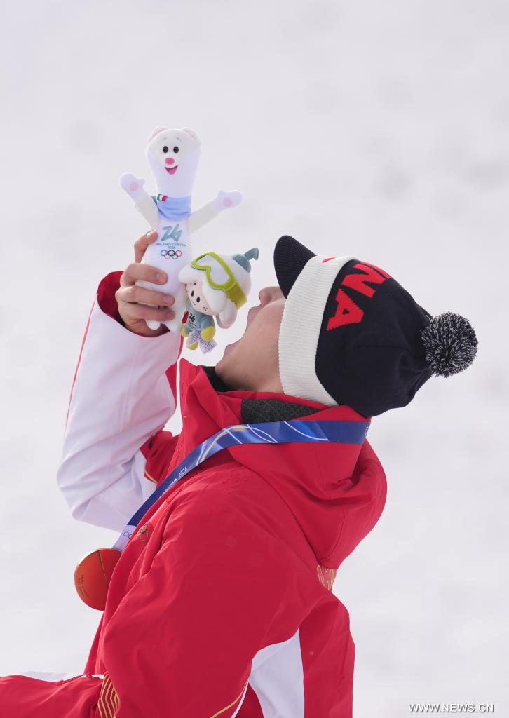 ليفينيو 20 فبراير 2026 (شينخوا) في الصورة الملتقطة يوم 20 فبراير 2026، الصيني، وانغ شين دي، الحائز على الميدالية الذهبية، يحتفل خلال مراسم توزيع الميداليات عقب مسابقة القفزات الهوائية في التزلج الحر للرجال، ضمن دورة الألعاب الأولمبية الشتوية ميلانو-كورتينا 2026 في ليفينيو، إيطاليا.