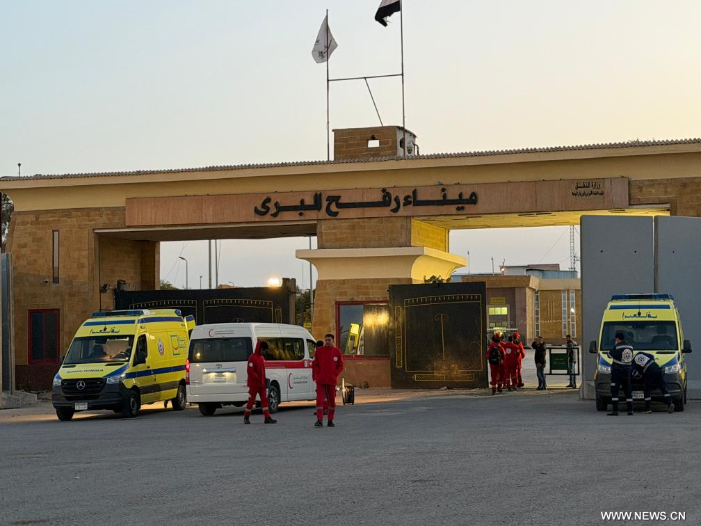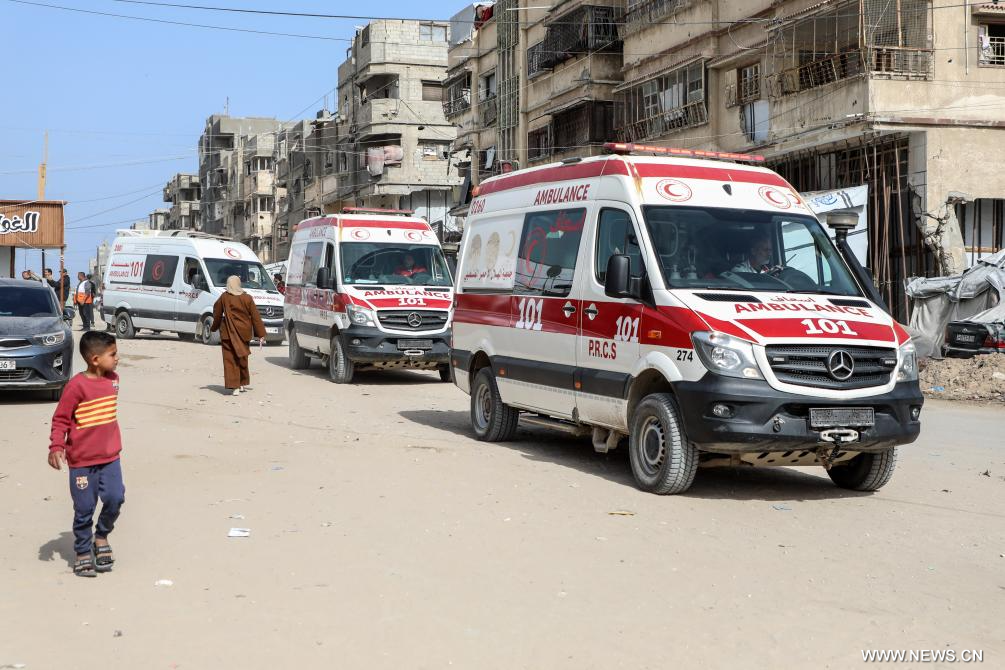 خان يونس 19 مارس 2026 (شينخوا) في الصورة الملتقطة يوم 19 مارس 2026، سيارات إسعاف تنقل مرضى فلسطينيين تتجه نحو معبر رفح الحدودي في خان يونس، جنوبي قطاع غزة. وقد غادر 25 فلسطينيا قطاع غزة متجهين إلى مصر اليوم (الخميس) عبر معبر رفح الحدودي، بعد إعادة فتحه في وقت سابق من اليوم.