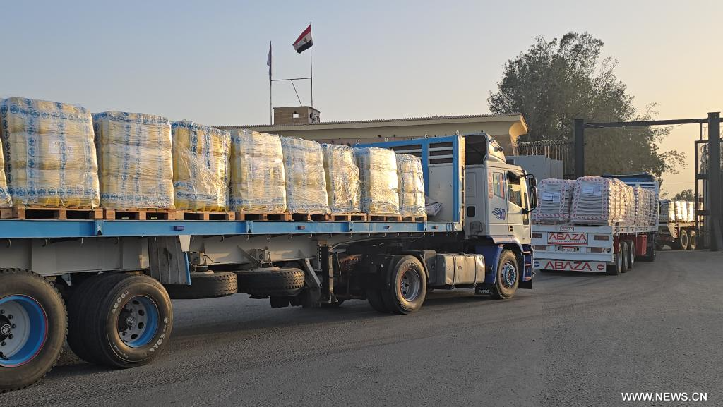 شمال سيناء 19 مارس 2026 (شينخوا) في الصورة الملتقطة يوم 19 مارس 2026، شاحنات تحمل مساعدات إنسانية على الجانب المصري من معبر رفح الحدودي.