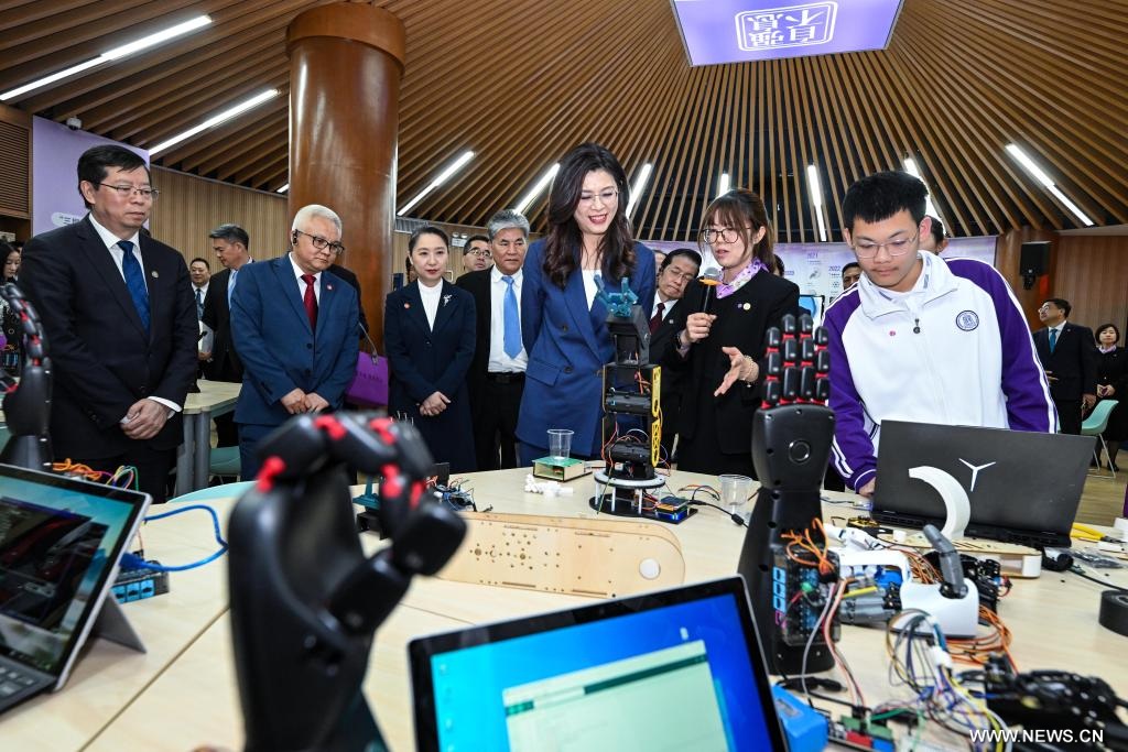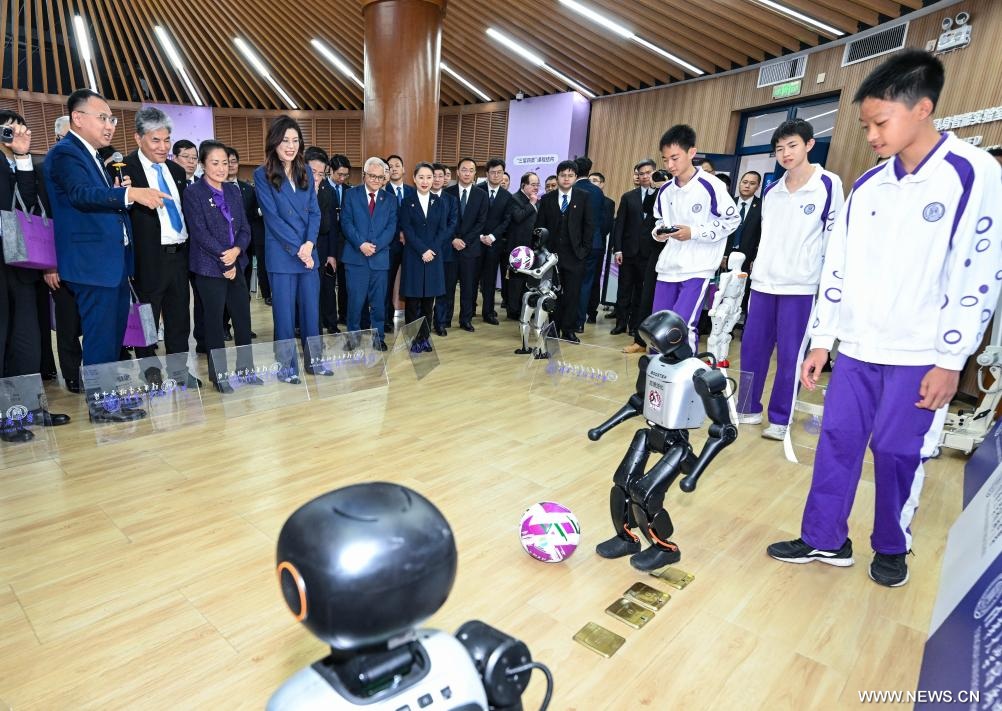 وكانت المحطة الأولى للوفد هي المدرسة الثانوية التابعة لجامعة تسينغهوا، حيث اطلعوا على تطبيقات الذكاء الاصطناعي في التدريس. وخلال تفقدهم معامل المدرسة، شاهد أعضاء الوفد مشروعات طورها الطلاب، من بينها مباريات كرة قدم للروبوتات، وكلاب روبوتية، وأذرع روبوتية.