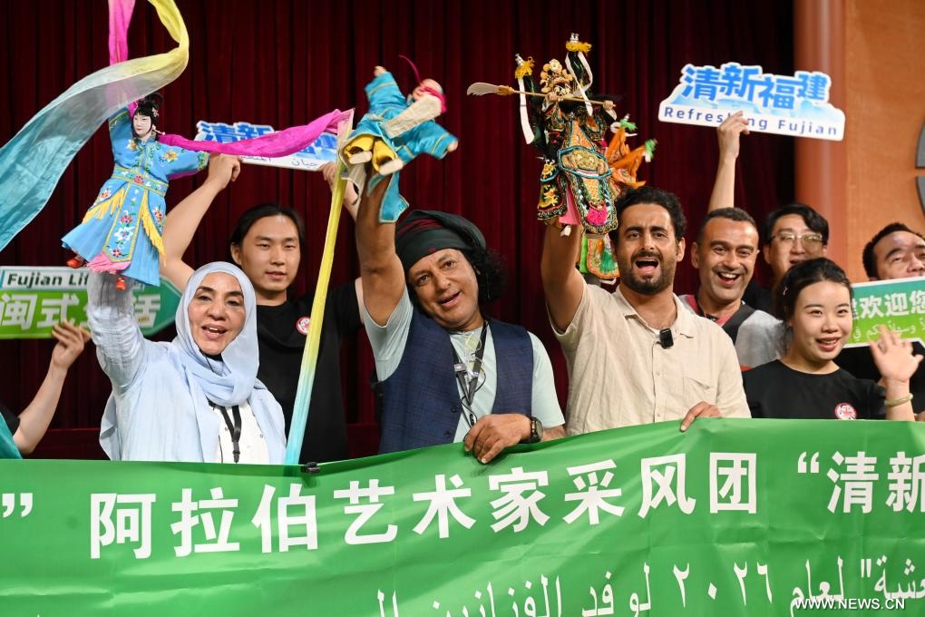 تشانغتشو 18 أبريل 2026 (شينخوا) في الصورة الملتقطة يوم 16 أبريل 2026، فنانون عرب وصينيون يأخذون صورا جماعية في بلدة تشانغتشو القديمة بمقاطعة فوجيان في جنوب شرقي الصين، حيث قام 9 فنانين عرب من الجزائر وسلطنة عمان ومصر وغيرها من الدول العربية بزيارة البلدة للتمتع بسحر الثقافة التقليدية المحلية.